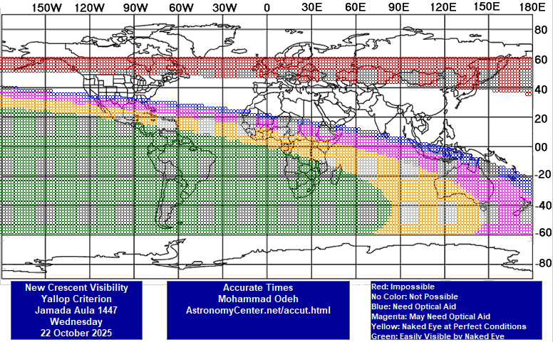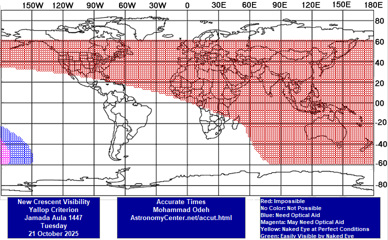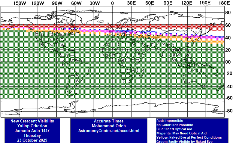 2- امّا در غروب چهارشنبه 30 مهر 1404 شمسی برابر با 22 اکتبر 2025 میلادی، در محدودههای آبی و صورتی و نارنجی و سبزرنگ نقشۀ دو (از جمله: استرالیا، بیشترِ اقیانوس هند، نیمۀ جنوبی قارّۀ آفریقا، بیشترِ آبهای اقیانوسهای اطلس و آرام، سراسر آمریکای مرکزی و جنوبی، و بخشی از آمریکای شمالی) رؤیت هلال با چشم مسلّح محقّق میشود؛ و از آنجا که ایران در بخشی از شب با محدودههای رؤیت هلال مشترک است، پنجشنبه 1 آبان 1404 شمسی برابر با 23 اکتبر 2025 میلادی، روز اوّل ماه جُمادَیالاُولیٰ 1447 قمری خواهد بود.