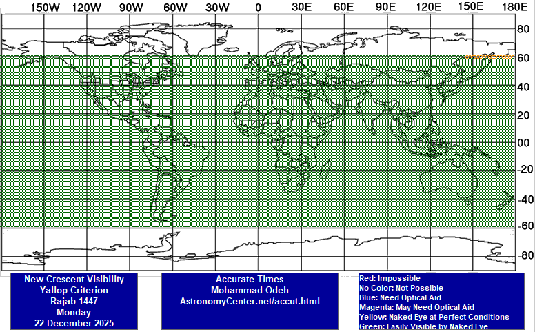 1- رؤیت هلال با چشم عادی در غروب شنبه 29 آذر 1404 شمسی برابر با 20 دسامبر 2025 میلادی، در محدودۀ سبزرنگ نقشۀ یک (مرکز و بخشی از شرق اقیانوس آرام) بهراحتی محقّق میشود؛ ازاینرو، برای ایران و همۀ نقاط زمین، یکشنبه 30 آذر 1404 شمسی برابر با 21 دسامبر 2025 میلادی، روز اوّل ماه رجب 1447 قمری خواهد بود.