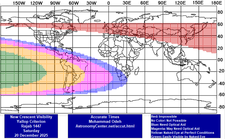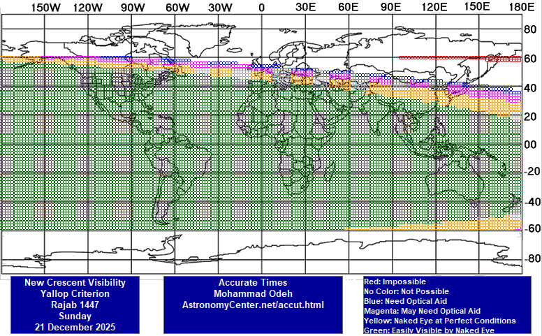 2- امّا در غروب شنبه 29 آذر 1404 شمسی برابر با 20 دسامبر 2025 میلادی، رؤیت هلال با چشم مسلّح در محدودههای آبی و صورتی و نارنجی و سبزرنگ نقشۀ یک (سراسر اقیانوس آرام و آمریکای مرکزی و جنوبی، بخشهایی اندک از آمریکای شمالی، بخشهایی از اقیانوس اطلس، و بخشهایی اندک از جنوب قارّۀ آفریقا) محقّق میشود؛ و از آنجا که در این محدودهها، مطمئنّاً هلال با چشم مسلّح دیده میشود و ایران هم در بخشی از شب با این محدودههای رؤیت هلال مشترک است، یکشنبه 30 آذر 1404 شمسی برابر با 21 دسامبر 2025 میلادی، روز اوّل ماه رجب 1447 قمری خواهد بود.